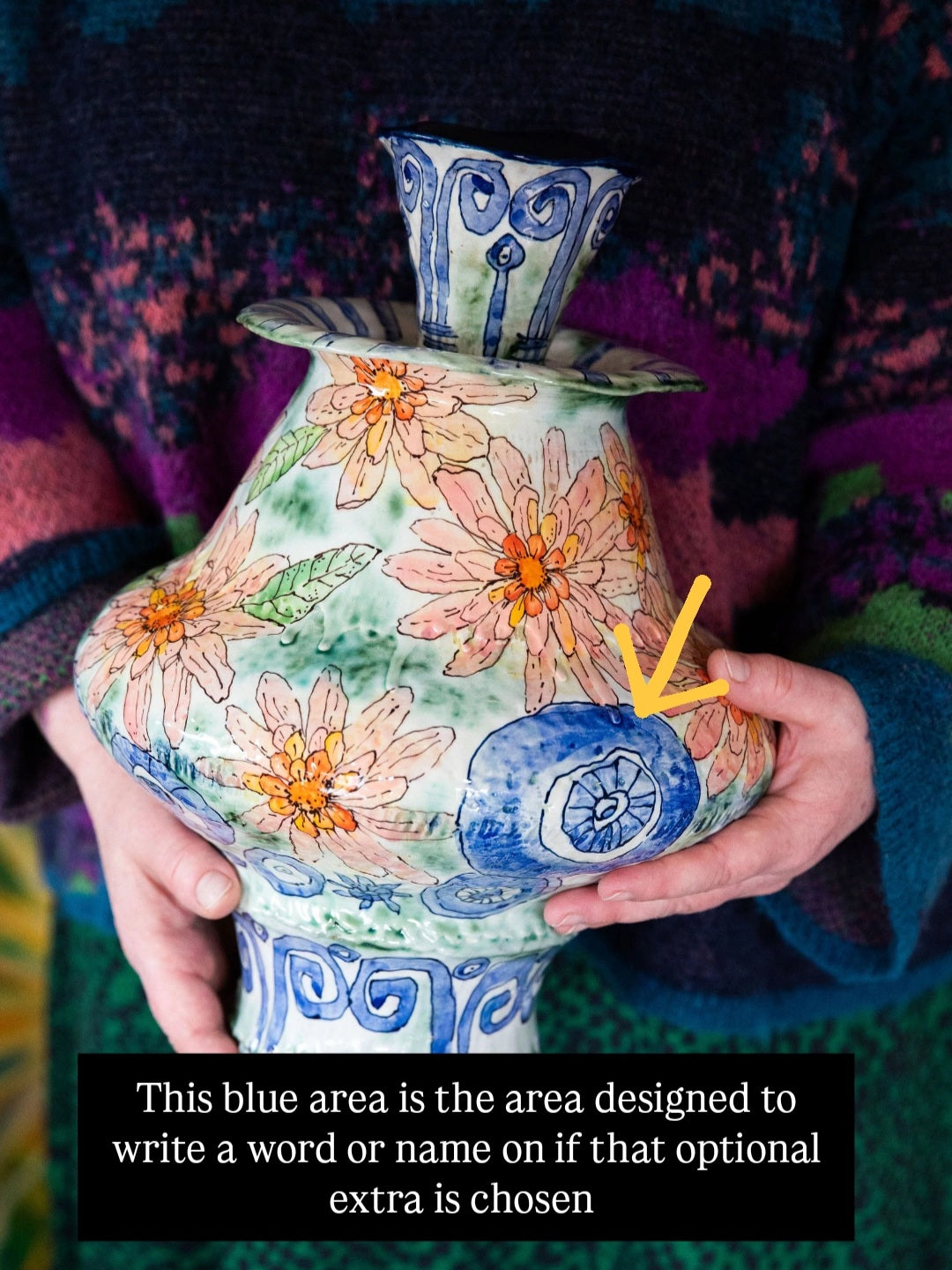 This urn includes a thoughtfully reserved space—a quiet patch of soft blue—where a single name or word can be added in gold lustre (gold only).